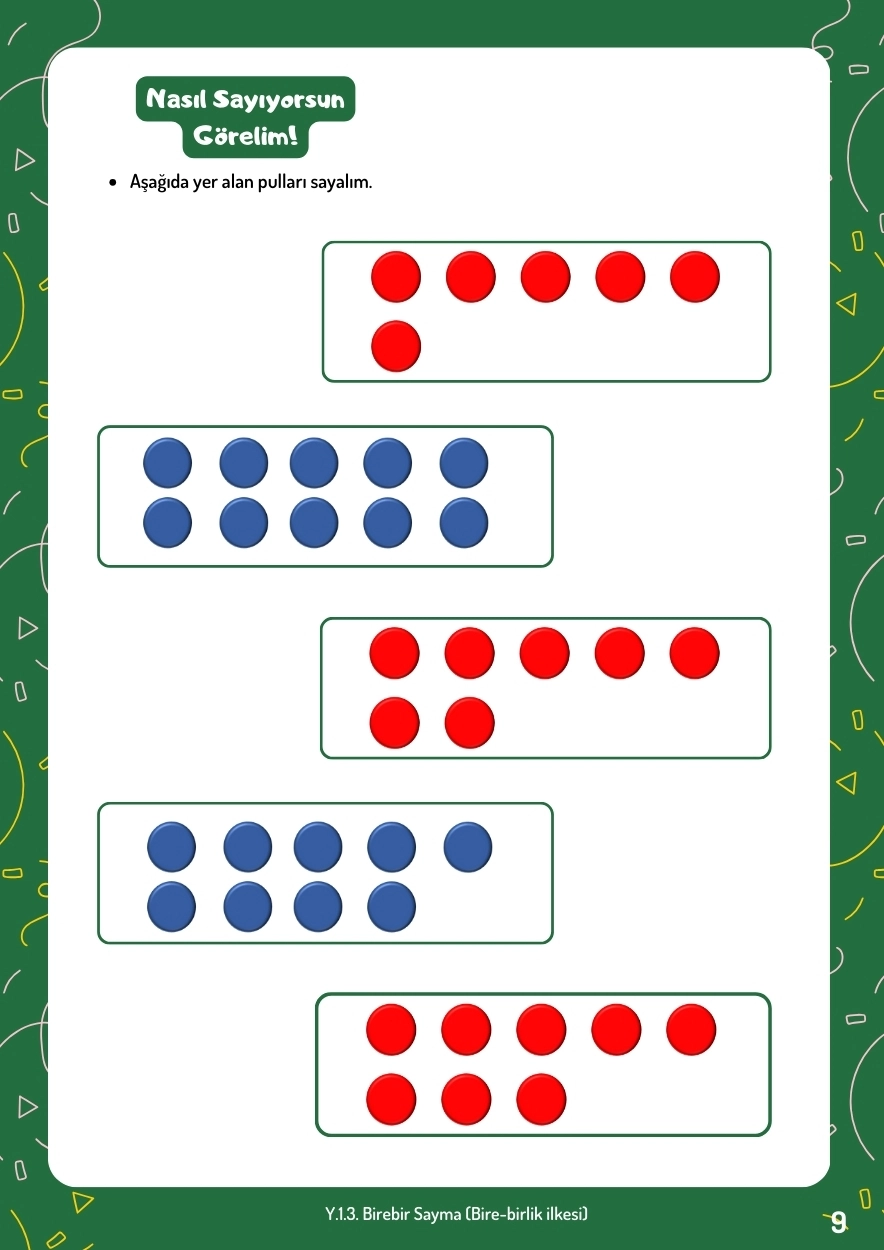 Etkinliklerde, somut materyal ya da çalışma yaprağındaki pullar gibi, çocuğun her bir pulu bir defa sayıp saymadığına dikkat edilmelidir. Bu şekilde, “Birebir sayma” ilkesi çerçevesinde değerlendirme yapabilirsiniz. Etkinlikler sırasında çocuğa pulları sayarken parmağıyla göstermesi ve sonucun doğru olup olmaması değil, pulları nasıl saydığına odaklanması gerektiği söylenmelidir.